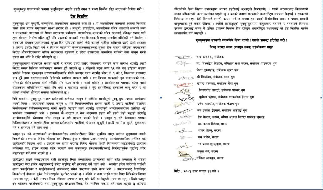 मन्त्रीस्तरीय वार्ता समिति हुनुपर्ने र ताप्लेजुङ लगायतको अन्य जिल्लाहरुमा पक्राउन परेकाहरुलाई विनासर्त रिहाइ गर्न माग गरेका छन् । केवलकार निर्माण बन्द गरिनुपर्ने र ताप्लेजुङ काफ्लेपाटीमा रहेको सुरक्षाकर्मी हटाइनु पर्ने माग विज्ञप्तिमा उल्लेख छ । जिल्ला प्रशासन कार्यालय ताप्लेजुङले १३ गते राती ११ बजेबाट निषेधाज्ञा हटाउन सुचना गरी सकेको छ ।