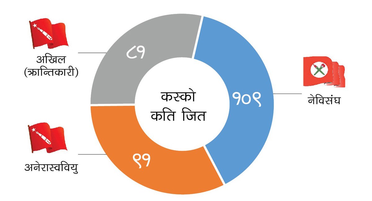 नेविसंघले काठमाडौंका ४ वटा आंगिकसहित १०९ आंगिक र सामुदायिक क्याम्पसमा जितेको नेविसंघका प्रवक्ता सुरज सेजुवालले जनाएको छ । राजधानीका थापाथली इन्जिनियरिङ क्याम्पस, आयुर्वेद क्याम्पस, महाराजगञ्ज चिकित्सा क्याम्पस र नर्सिङ क्याम्पसमा नेविसंघले जित हासिल गरेको छ। अनेरास्ववियुले ११ वटा आंगिक क्याम्पससहित ९१ क्याम्पस जितेको प्रवक्ता प्रकाश पौडेलले बताउनु भयो । काठमाडौंका तीनवटा आंगिक क्याम्पसमा अनेस्ववियुको नेतृत्व छ।