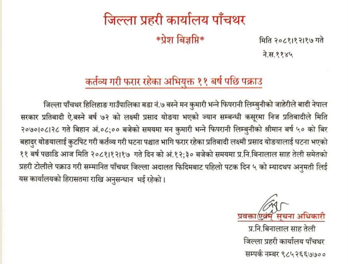 पाँचथर । कर्तव्य ज्यान सम्बन्धि फरार अभियुक्त ११ बर्ष पछि पक्राउ परेका छन् । जिल्ला प्रहरी कार्यालय पाँचथरले कुटपिट गरि कर्तव्य ज्यान सम्बन्धि मुद्दामा अदालतले दोषि ठहर गरेका ७२ बर्षिया लक्ष्मी प्रसाद योङयालाई प्रहरीले पक्राउ गरेका हुन । जिल्ला प्रहरी कार्यालय पाँचथरले प्रेस विज्ञप्तिमा उल्लेख्य गरेको छ ।