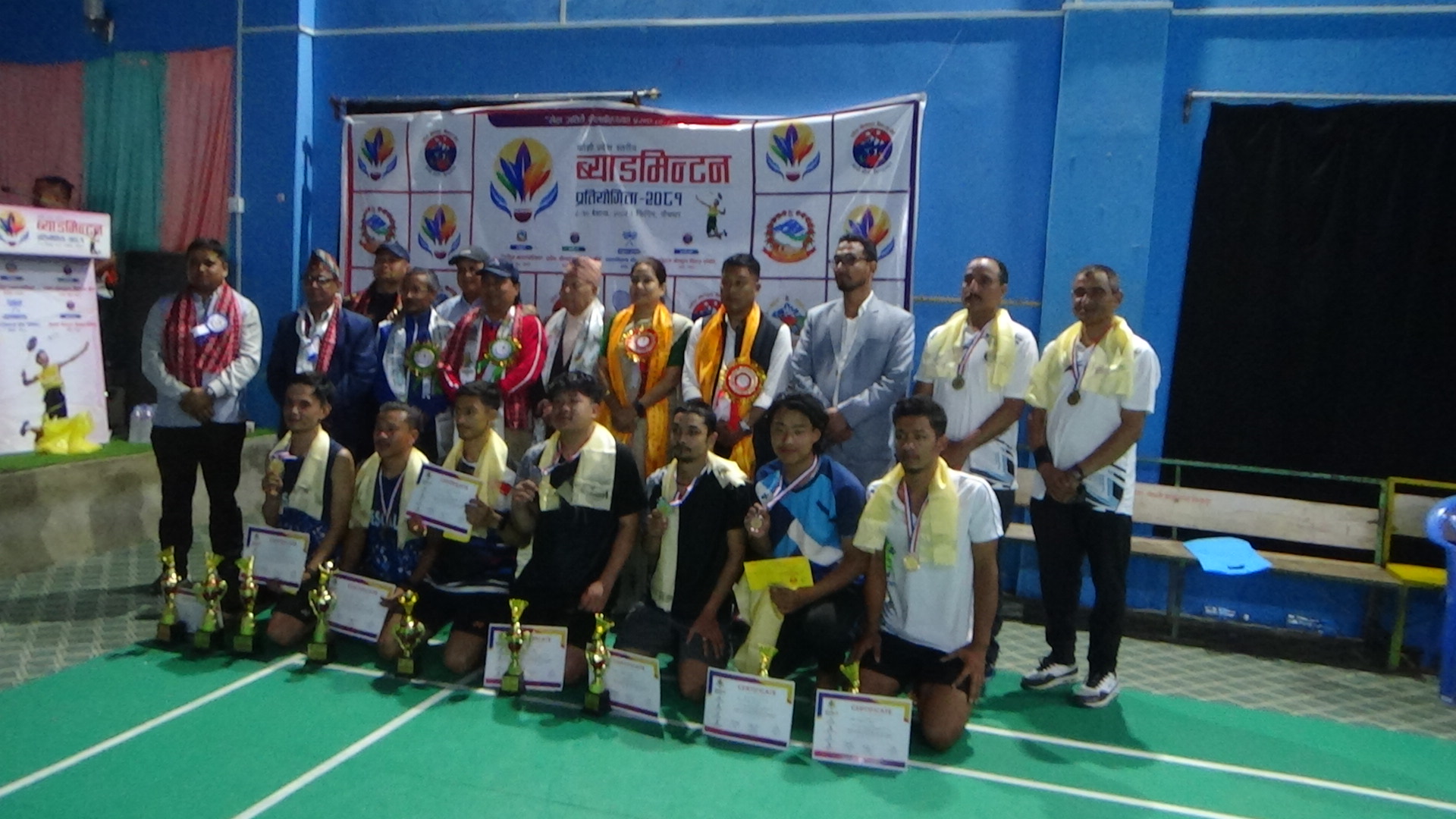 ५५ बर्षभन्दा माथि समुह जोडीमा भने गणेस चन्द र पुर्णचन्द्र जोशि प्रथम भएका छन् । रामराज आङदेम्बे र उत्तम सिंखडा दितृय र बुद्ध चौधारी र विष्णुलाल श्रेष्ठ तृतिय हुन सफल भएको पाँचथर ब्याडमिन्टन संघ सदस्य निराजन श्रेष्ठले जनाएको छ । ब्याडमिन्टन प्रतियोगिताको हरेक विधाका विजेताले ट्रफिसहित १५ हजार, दोस्रोले १० हजार र तेस्रोले ५ हजार रकम पाएकाछन् । ४५ वर्ष माथि र ५५ वर्ष माथिका खुल्ला भेट्रान्स प्रतियोगिता तर्फका विजेताले ३० हजार र दोस्रो हुनेले २० हजार रुपैयाँ नगद सहित टफिमेडल पुरस्कार पाएका छन् । कोशी प्रदेशका खेलकुद विकास बोर्ड उपाध्यक्ष बिद्या कार्कीले टफि मेडल र नगद पुरस्कार वितरण गर्नु भयो । प्रदेश स्तरीय ब्याडमिन्टन प्रतियोगितामा मेन सिङगल २० टिम, ओमेन सिङगल १५ टिम र मेन डबल १६ टिम र मिक्स डबलमा १० टिम खेलाडी खेल प्रतियोगितामा भाग लिएका थिए ।
