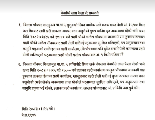 जिल्लाको मिक्लाजुङ गाउँपालिका–५ वडामा एक जना र फाल्गुनन्द गाउँपालिका–५ वडा स्थित सुलुम्फी क्षेत्रबाट एक जनाको शव फेला परेको हो ।मृतकहरूको पहिचान अहिलेसम्म खुल्न नसकेको जिल्ला प्रहरी कार्यालय पाँचथरले जनाएको छ ।
