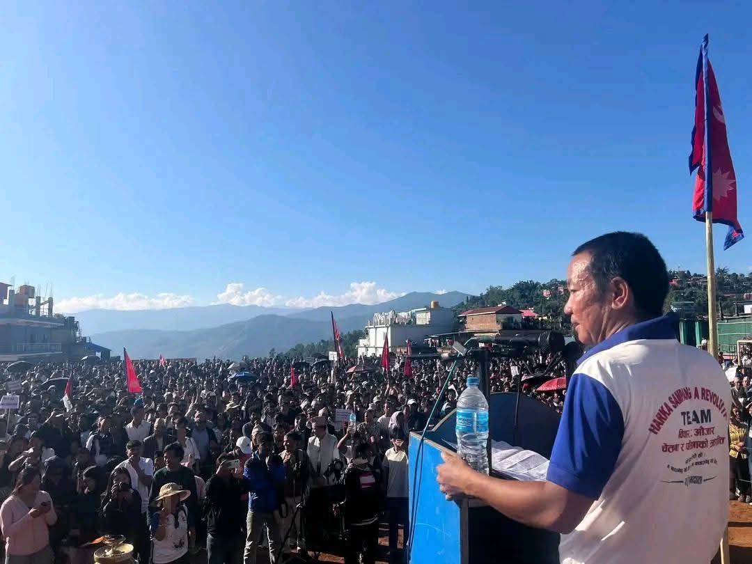बजार परिक्रमा गरी फिदिम माविको खेलमैदानमा सभामा साम्पाङले नेपालका ठुला एवं पुराना पार्टीका नेताको तिब्र आलोचना सहितको टिकाटिपणी गर्दै उनले माटोमा गरिने श्रमबाट देस विकास संभाव भएको बताए ।
