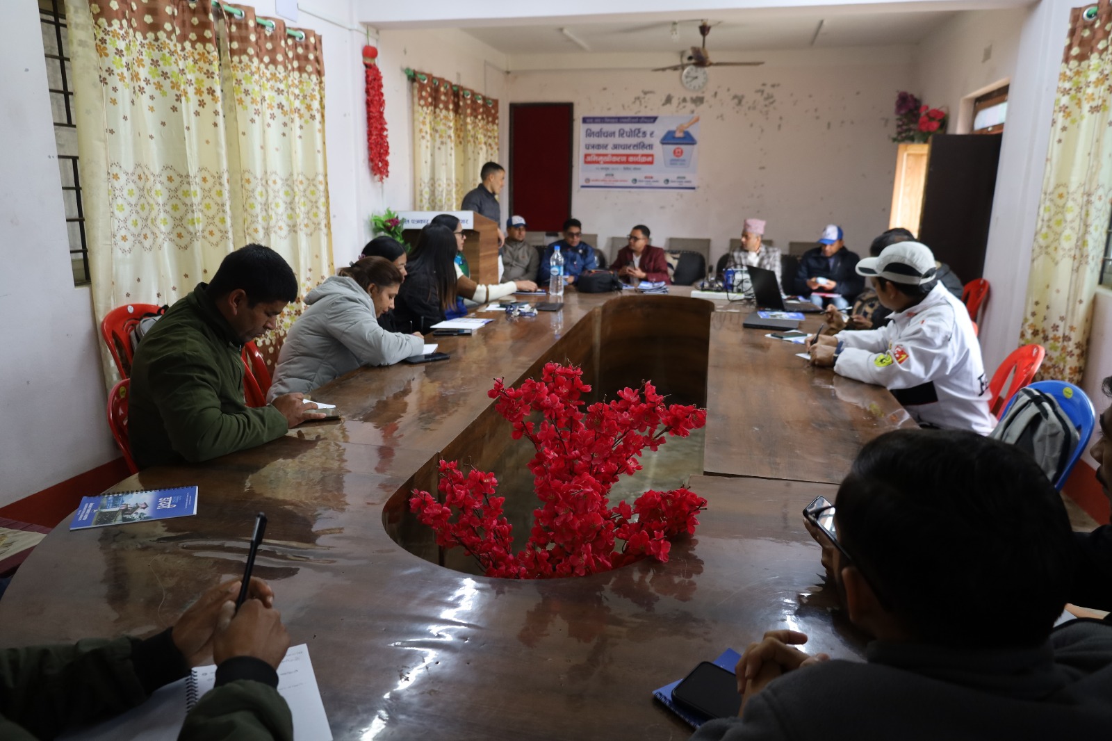 पत्रकार भेलामा जिल्ला निर्वाचन कार्यालय प्रमुख निर्वाचत अधिकृत कुमार मास्केले पत्रकार स्वयम निर्वाचन कार्यन्वयनमा अग्रणी भुमिका निर्भाह गर्न आग्रह गरेकाछन् । छिटफुट मात्रमा निर्वाचन आचारसंहिता उलङघनका क्रियाकलापहरु भएका बाहेक अन्यकेही नभएको जानकारी गराउदै शान्तिपुर्ण वातावरणको निर्वाचन गर्नमा पत्रकारको अहम भुमिका रहने बताए ।