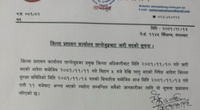 ताप्लेजुङ । ताप्लेजुङको फुङलिङबजार क्षेत्रमा आइतबार जारी गरेको निषेध आज राति ११ बजेबाट हटाएको छ